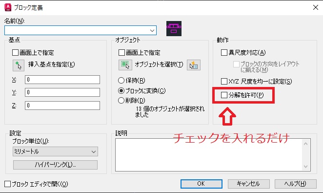3. ブロック作成のダイアログがでてくるので、”分解”にチェックを入れます。